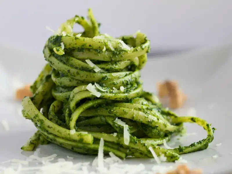 - Die Nudeln abgießen und mit dem Basilikum-Pesto von Cascina San Giovanni vermengen.