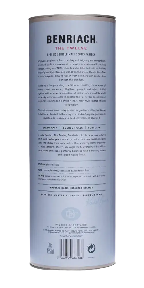 Unter Billy Walkers Führung und mit Experten wie der Master Blenderin Dr. Rachel Barrie festigte Benriach seinen Ruf als führende Whisky-Marke. Heute, mit einer tiefen Tradition und einem Blick in die Zukunft, repräsentiert Benriach den reichen Charakter von Speyside in jeder Flasche.