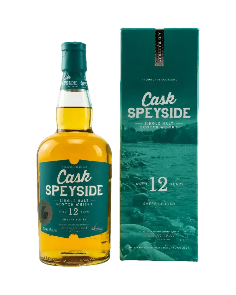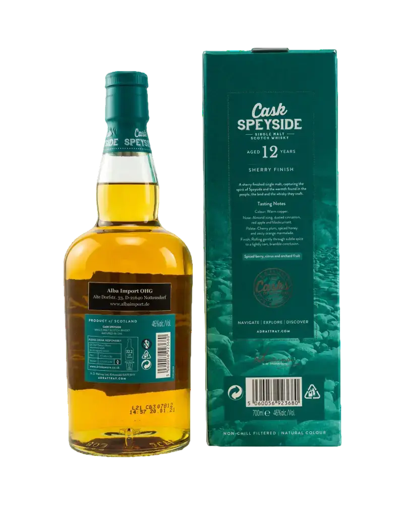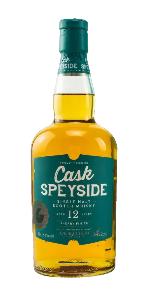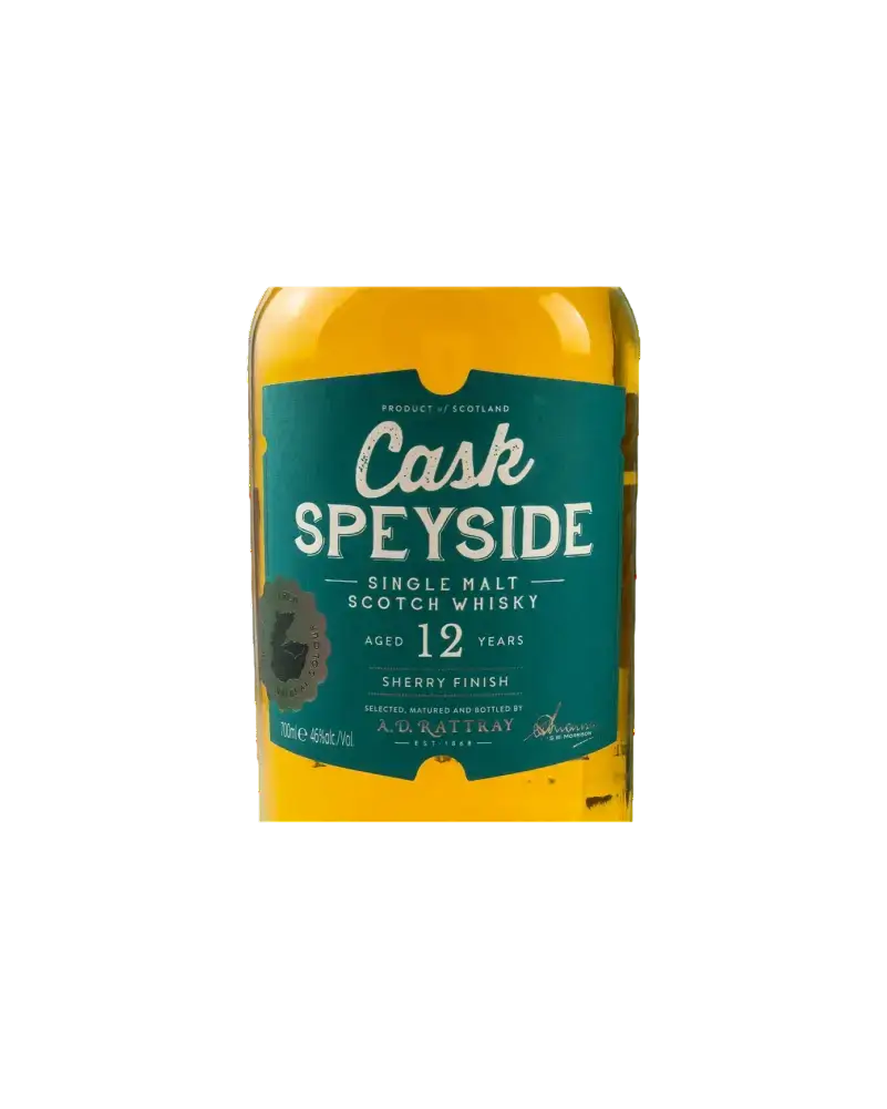 Der kupferfarbene Cask Speyside aus dem Hause A.D. Rattray verbrachte für 12 Jahre seine Reifezeit in Ex-Bourbon Fässern. Das Finish erhielt der Single Malt in Sherry Fässern, was sich im Nase und Mund bemerkbar macht. Deine Nase vernimmt Mandel, Zimt, rote Äpfel und schwarze Johannisbeere. Am Gaumen empfängst du Kirschpflaume, gewürzten Honig und pikante Orangenmarmelade. Der Nachklang dieses Scotch Whisky hat eine leichte Würze, ist leicht herb und brombeerartig.