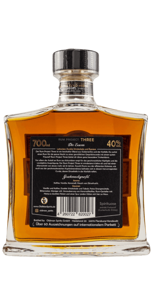 Die Sinnlichkeit für den Old Man Project Three wird durch drei südamerikanischen und karibischen Rumsorten, mit einer durchschnittlichen Reifezeit von 10 Jahren im Eichenfass geschaffen. Vollmundig, filigran, samtig und harmonisch sorgen für diese eindrucksvollen Momente voller Tiefe, was deine Geschmacksknospen zum strahlen bringen. Karamell und cremige Vanille mit einem Hauch von Espresso verführen deine Nase mit einem kräftigen und bittersüßen Augenblick. Im Mund entfalten sich bei diesem Rum Noten von Toffee und Schokolade, die mit Vanille und leicht würzigem Rauch. Bitternoten von Kaffee und Schokolade weisen dir den Weg zum Ende.