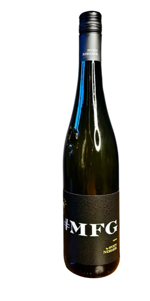 #MFG (Mit freundlichen Grüßen) ist die markante Cuvée von Sven Nieger aus Baden. Riesling und Chardonnay verbinden sich zu einem veganen, trocken ausgebauten Landwein, der Mineralität, Frische und Struktur vereint. Im Edelstahl vergoren, zeigt er Aromen von Zitrus, grünem Apfel, Kräutern und feiner Hefe. Am Gaumen straff, klar und präzise, mit anhaltender Frische im Abgang. Ein puristischer, schnörkelloser Wein für Aperitifs, leichte Gerichte und gesellige Abende.