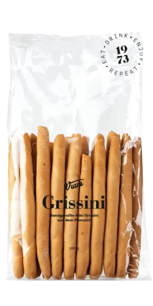 Die Mini Grissini aus dem Piemont sind eine knusprige Köstlichkeit und mit seinem authentischen Geschmack Italiens. Dazu braucht es nicht viel um diese kleinen Brotstangen zu fertigen. Feinstes Mehl, Olivenöl und Salz. Grissini sind die perfekte Begleitung zu Wein und Käse.