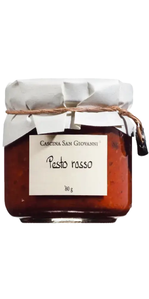Entdecken das Pesto Rosso von Cascina San Giovanni, eine verführerische mediterrane Gewürzpaste. Sorgfältig hergestellt aus sonnengetrockneten Tomaten, erstklassigem Olivenöl, aromatischem Basilikum und erlesenen Kräutern, bietet diese Spezialität aus Italien eine wahre Geschmacksexplosion. Verleihe deinen Gerichten mit dem Pesto Rosso von Cascina San Giovanni eine mediterrane Note. Ideal als Pastasauce, auf geröstetem Brot mit Ziegenkäse oder als Dip zu Gemüse – diese Gewürzpaste ist die perfekte Ergänzung für kulinarische Genussmomente. Tauche ein in die Aromen Italiens und verwöhne deinen Gaumen mit dieser einzigartigen Köstlichkeit. Buon Appetito!