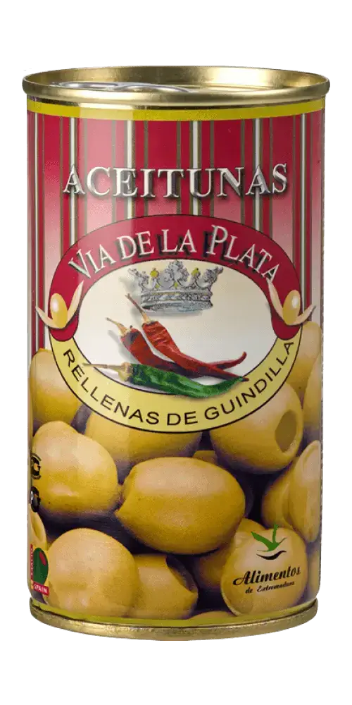 Die grünen spanischen Oliven - Aceitunas Rellenas de Guindilla - Aceitunera del Guadiana stammen aus der Extremadura sind würzig und fest und werden mit einer Peperonipaste gefüllt.
