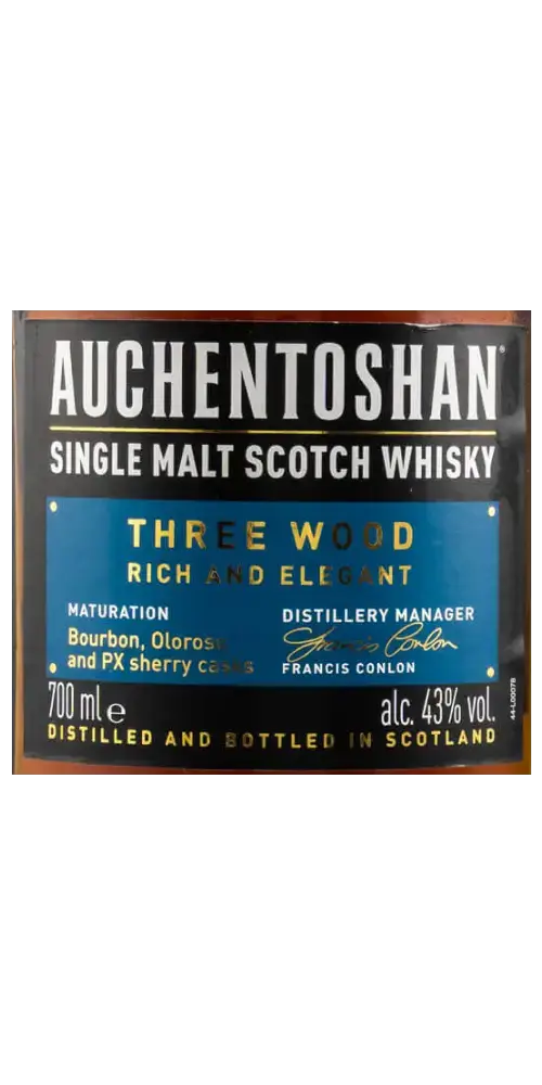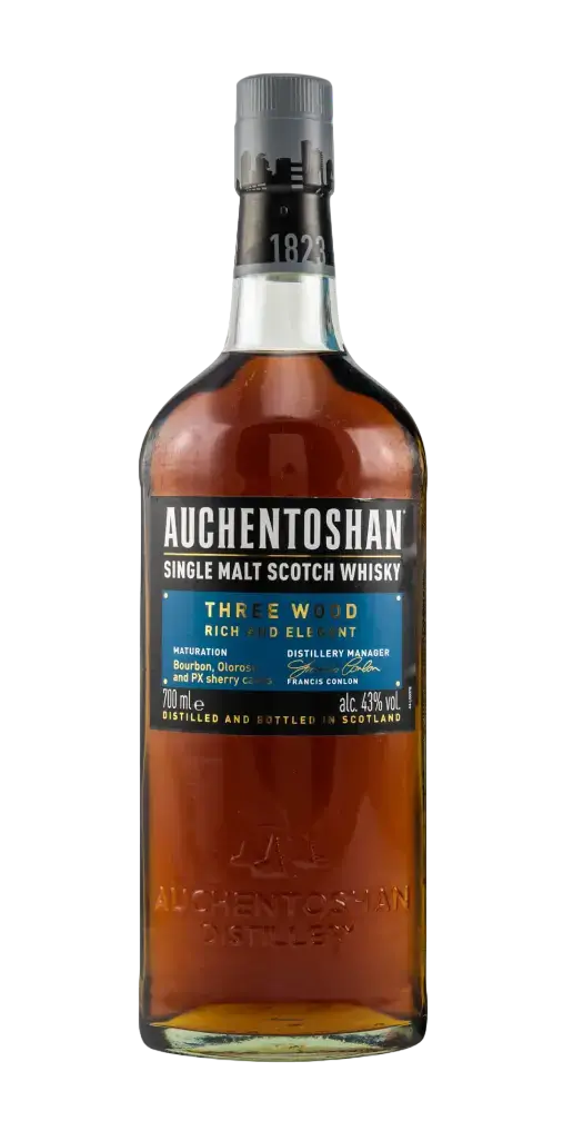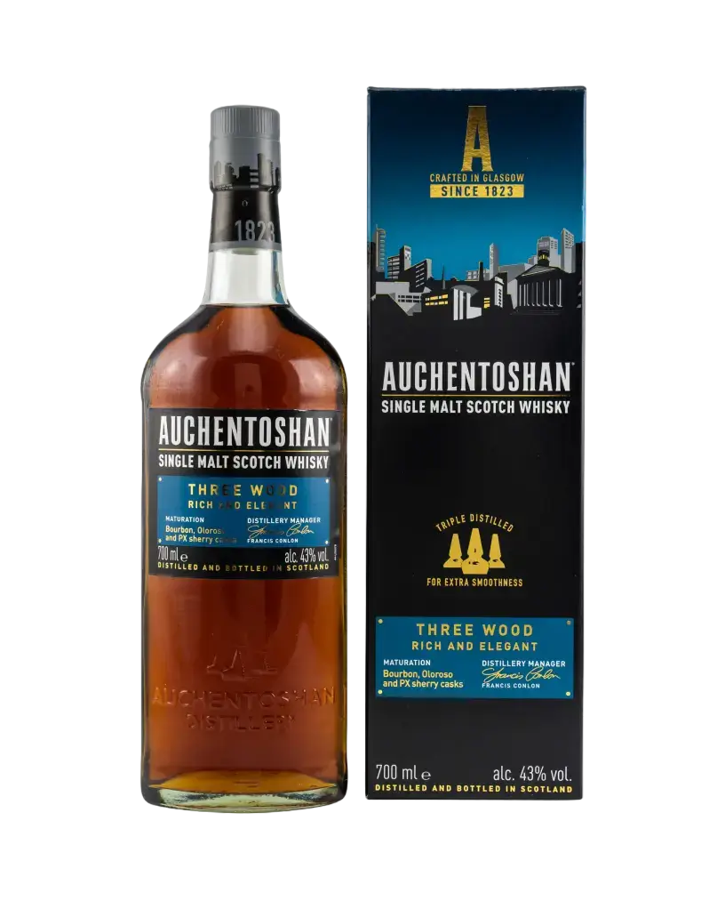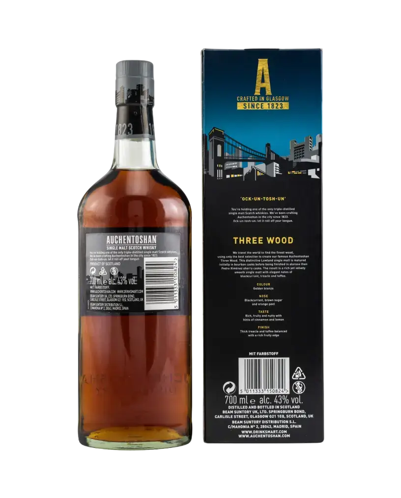 Der Auchentoshan TREE WOOD Single Malt wird zuerst in amerikanischer Bourbon, anschließend in spanischer Oloroso-Sherry und dann zum Finish im Pedro Ximenez Sherry-Fässern ausgebaut. Dieses Dreiergespannt belohnt deine Nase mit schwarzer Johannisbeere, braunem Zucker, Orangen-, Pflaumen- und Rosinennoten. Auf der Zungen erwarten dich Haselnüsse mit einem Hauch von Zimt und Zitrone. Obst und Sirup mit einer Butterscotch Süße tragen zur Gesamtkomplexität bei. Der Nachklang dieses Scotch Whisky aus den Lowlands ist geschmeidig, erfrischend und fruchtig mit einer anhaltenden Süße von Eiche.