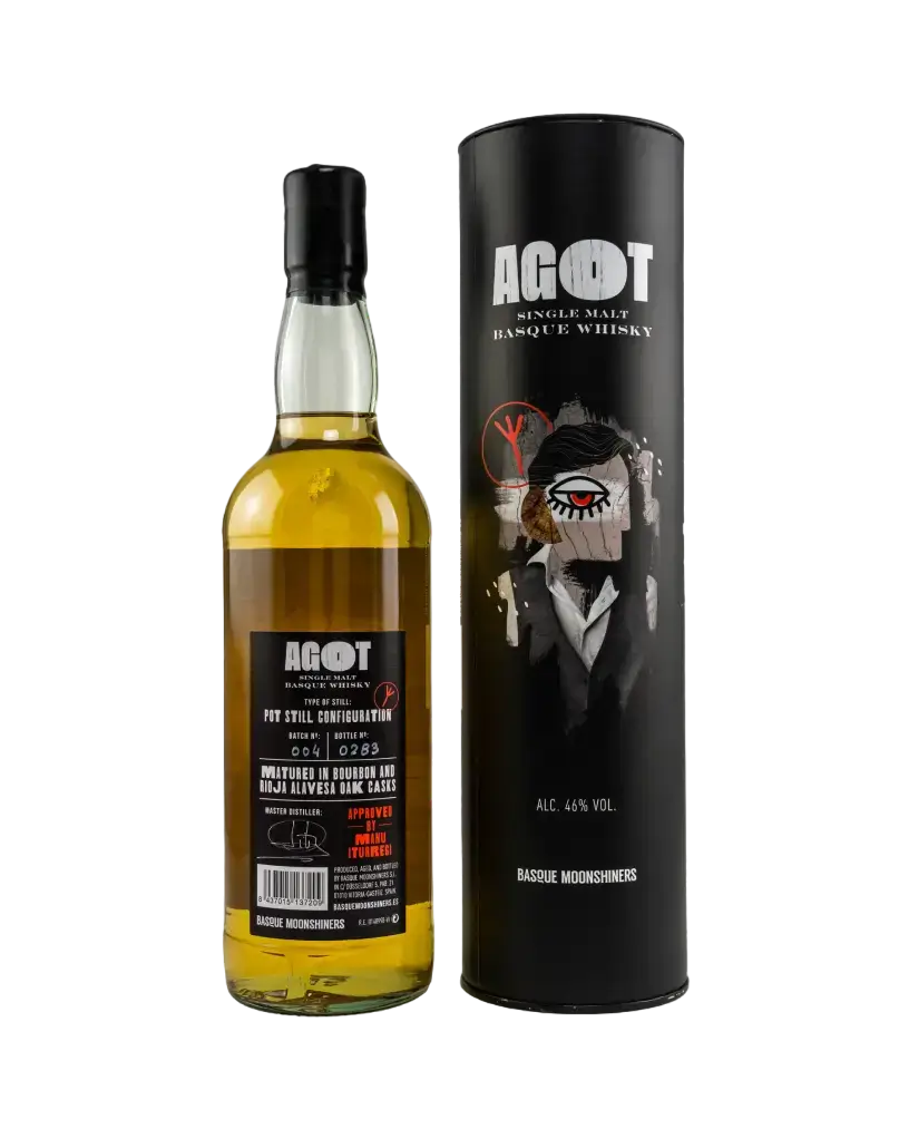 Lokales Navarra Malz der Sorte Pils und München werden in der Distellery Basque Moonshiners für den Agot verwendet. Der Agot durchläuft eine zweifache Destillation in der Kupferbrennblase und wird dann für drei Jahre in Ex-Bourbon und Ex Rioja Alavesa Fässern gelagert. Der Charakter des Malts ist mit frischen und zarten Aromen von Toffee, Vanille und Kakao in der Nase zu beschreiben. Im Mund fühlt er sich zart und geschmeidig mit frischen Noten von Vanille an. Der Abgang ist anhaltend würzig und trocken.