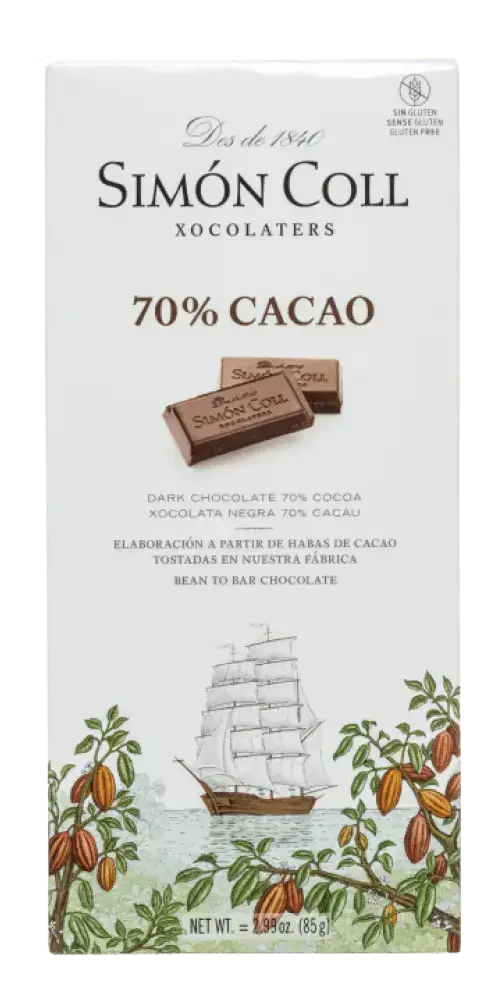 Das katalanische Traditionshaus Simón Coll produziert sein 1840 nach einem alten Familienrezept ihre Schokolade in Barcelona. Diese extrafeine spanische Bitter-Schokolade hat einen Kakaoanteil von mind. 70%.