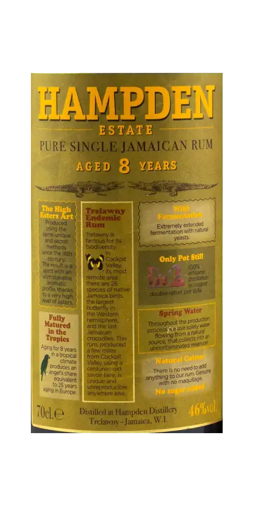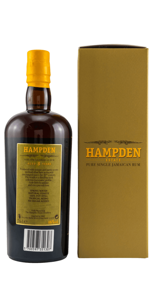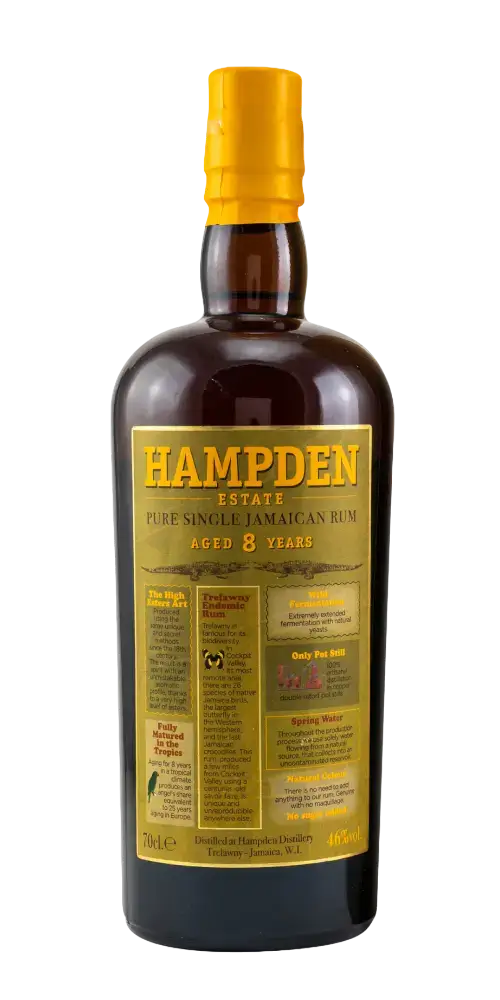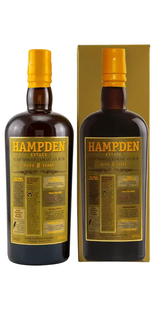 Der 8-jährige Hampden Estate reift im tropischen Klima Jamaikas, was einer vergleichbaren Reifezeit von fast 25 Jahren in Europa entspricht. Das Bouquet zeigt sich üppig und intensiv mit Noten von getrockneten Orangenschalen, Bratapfel, reifen Bananen und Piment. Der Gaumen erfährt angenehme Noten von Ingwer, Vanille, Kaffeebohnen, Pralinen und dunkler Schokolade. Der verlockende Abgang ist langanhaltend und wachsartig.
