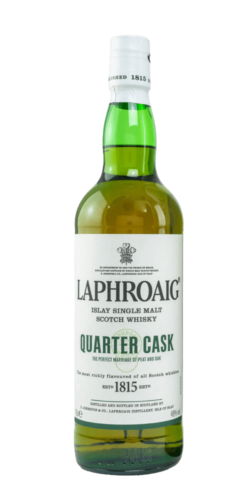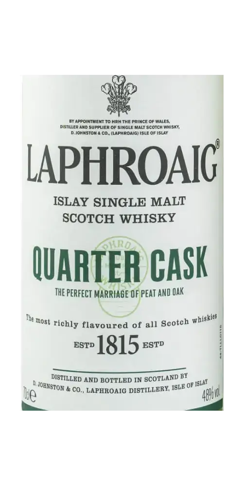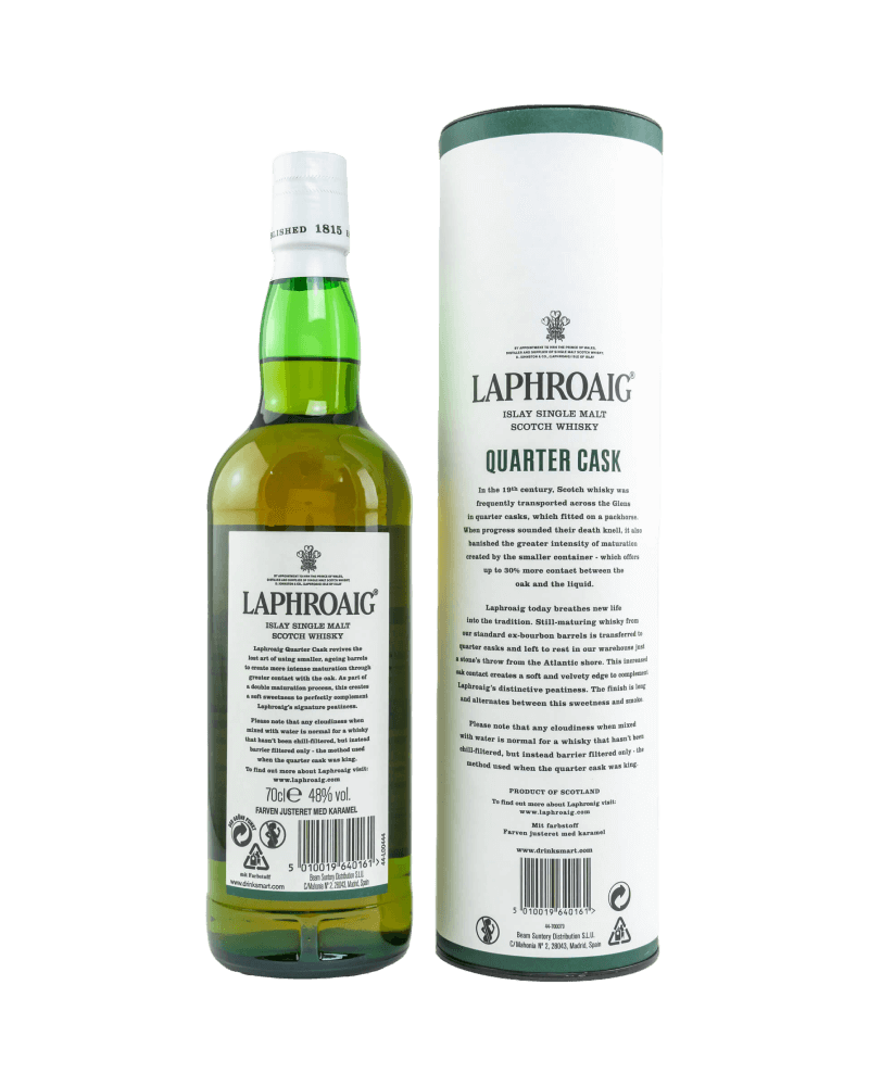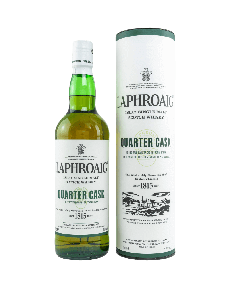 Zunächst reift der Single Malt in Ex-Bourbon Fässern um dann in Quarter Casks weiter zu reifen. Somit hat das Destillat mehr Kontakt zum Holz. Das verleiht dem Scotch Whisky den typischen Laphroaig Geschmack. Dieser rauchige Torf mit der Süße und den Noten von Kokosnuss, Banane und Vanille bilden das Finale. Der Geschmack ist komplex, vollmundig und viel Torfrauch mit der gewissen Laphroaig Süße. Der Nachklang dieses Islay Gewächses ist lang, trocken mit Torfrauch und Gewürzen.