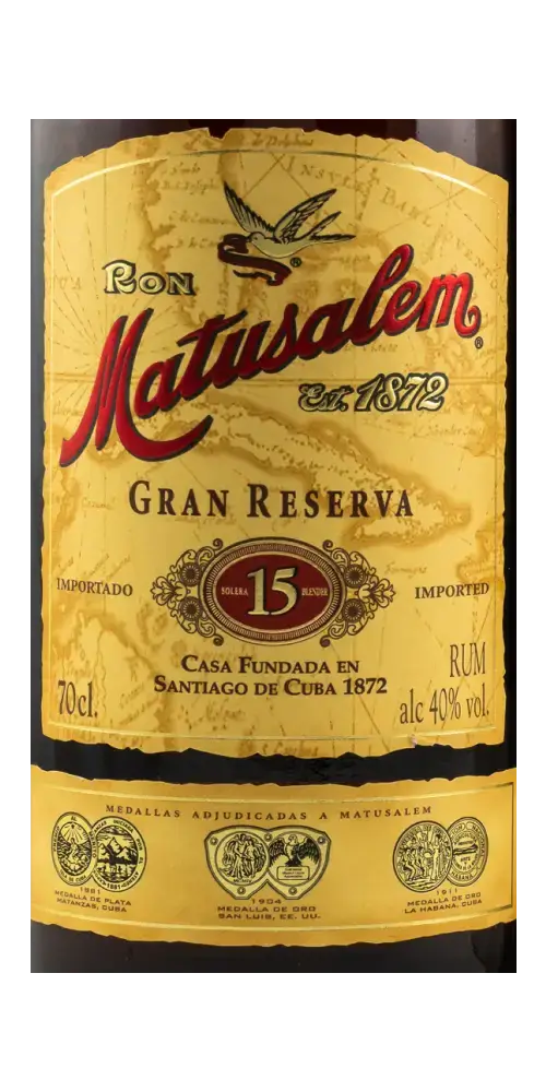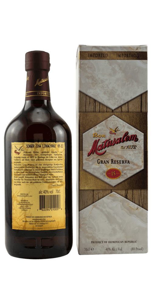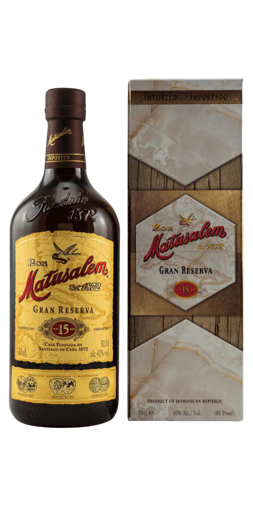 Der 15jährige Matusalem Gran Reserva wurde in Kuba geboren und auf der Dominikanischen Republik hergestellt und bildet das Flaggschiff aus dem Hause Matusalem. In der Nase zeigt er sich mit Vanille, Melasse, Pflaume und Karamell. Dieser Rum überzeugt durch seine trockenen, buttrigen und holzigen Geschmacksnoten, die durch Vanille, Melasse und Pflaume ergänzt werden. Die Trockenheit wird durch seinen Zuckergehalt von lediglich 5,7 g unterstrichen. Der Nachklang zeigt sich trocken und lang anhaltend.