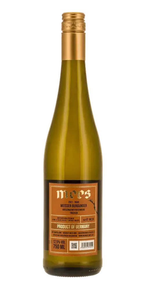 Der Charakter des Weißburgunder vom Weingut Mees (Nahe) aus den Lagen Kreuznacher Rosenbergs ist mit komplexer Mineralität und einem zarten Schmelz zu beschreiben. Im Glas schimmern ein hellgrün-gelbes Farbspiel und ein Duft von Wildkräutern durchströmen deine Nase. Im Mund entfalten dieser deutsche Weißwein mineralische Elemente, Kräuter und Stachelbeere und abgerundet wird der Geschmack mit einem zarten Schmelz.