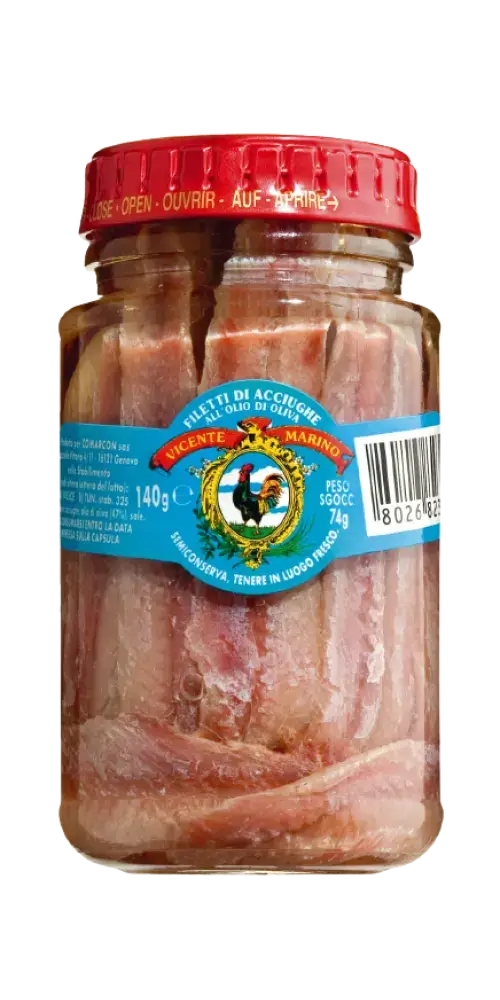 Comarcon S.a.S. steht seit über 100 Jahren für exzellente Fischkonserven. Die von Hand verarbeiteten Sardellen, Makrelen und Thunfischfilets werden nach traditioneller Methode in hochwertigem Olivenöl eingelegt. Gegründet von Santo Marino, der sein sizilianisches Wissen in die baskische Küste brachte, bietet die Marke Vicente Marino heute erstklassige Produkte, die durch Qualität und Handwerkskunst überzeugen. Entdecke den authentischen Geschmack des Mittelmeers.