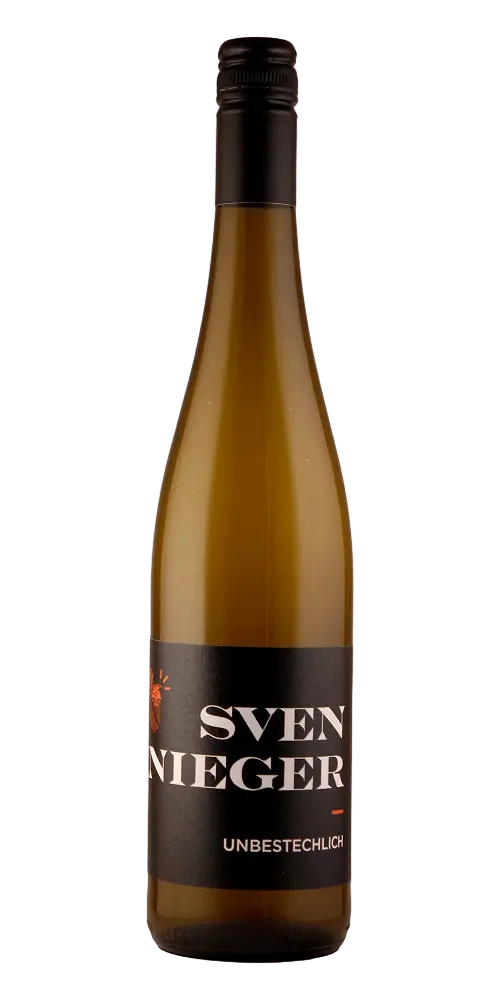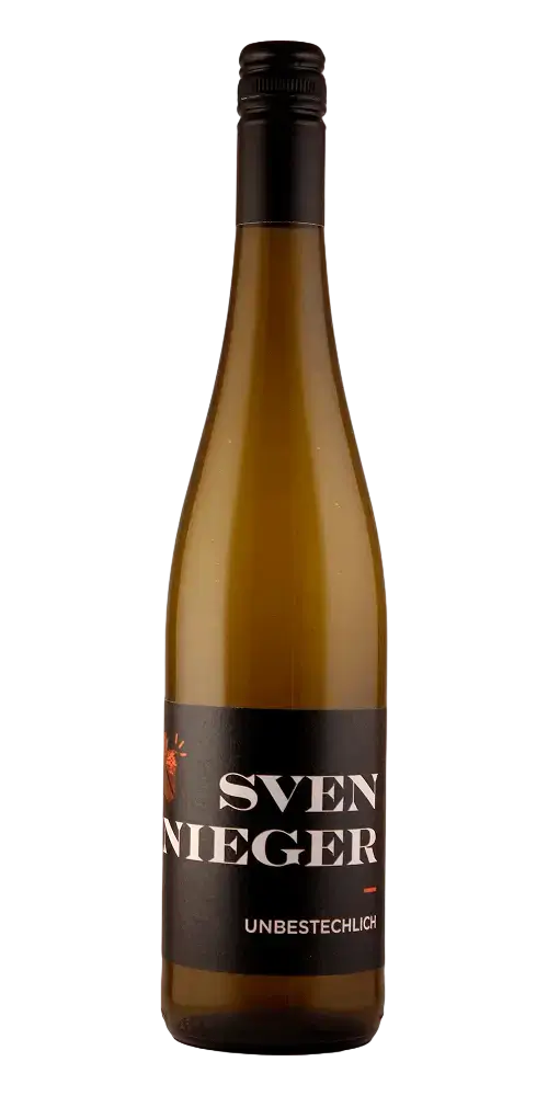 Der Unbestechlich 2019 von Sven Nieger ist ein veganer Riesling Landwein aus Baden, ausgebaut im Edelstahl und Barrique. In der Nase pflanzlich-würzig, mit wachsiger Zitrusfrucht, Steinobst, Tabak und Unterholz. Am Gaumen trocken, kraftvoll und komplex, mit feiner Säure, Umami und mürbem Gerbstoff. Petrolige Spuren, Kräuter und mineralischer Kern verleihen Tiefe. Ein herb-würziger Riesling, der mit Luft gewinnt und Lagerpotenzial bis 2027+ bietet.