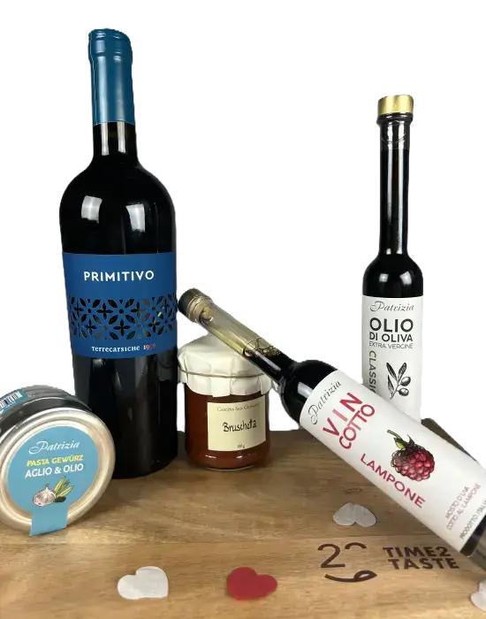 1 x Primitivo, 1 x Olivenöl, 1 x Gewürzmischung, 1 x Bruschetta, 1 x Vincotto Lampone (ohne Deko)