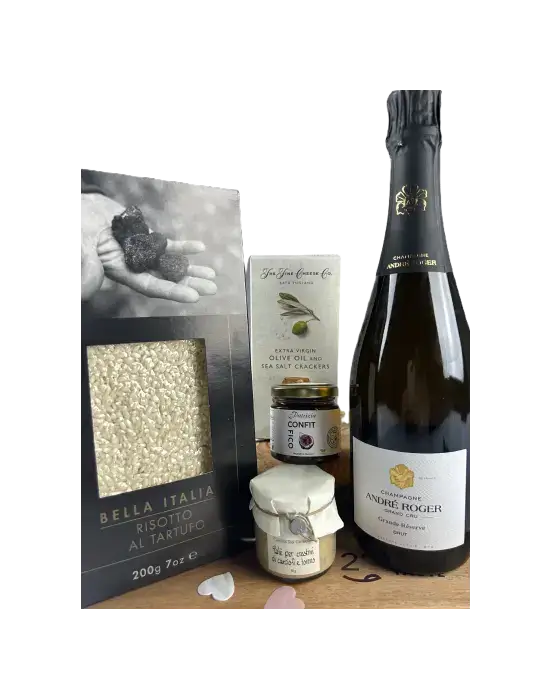 1 x Champagner, 1 x Risotto, 1 x Corstinicreme, 1 x Cracker, 1 x Feigenkonfitüre (ohne Deko)